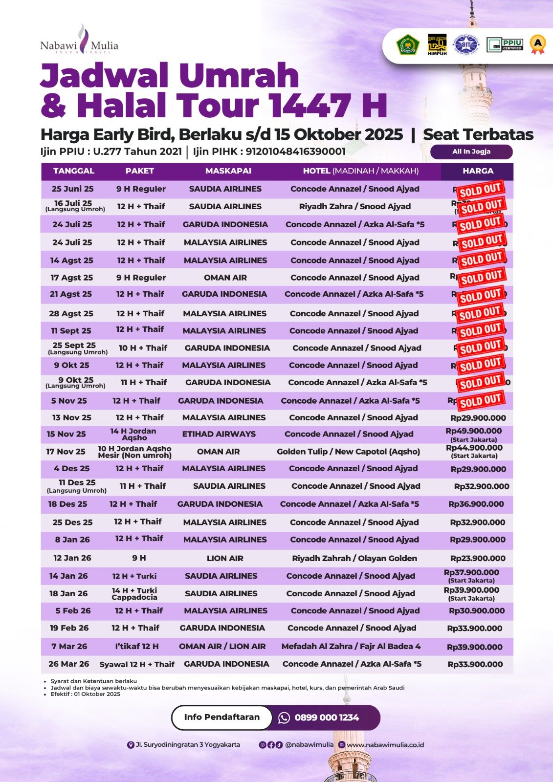 Cocok bagi jamaah yang sibuk atau berada di luar kota, dengan sistem yang fleksibel dan efisien. Umrah Jogja kini semakin mudah dengan layanan terbaik dari Nabawi Mulia.